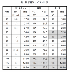 ポリエチレン管を主として、鋼管、塩ビ管との呼称・サイズの対比です。